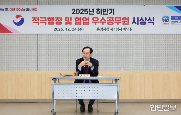 한민일보 서울포커스 김서윤 기자 | 통영시는 24일 제1청사 회의실에서 2025년 하반기 적극행정 및 협업 우수공무원 시상식을 개최하고,적극적인 문제 해결과 부서 간 협업을 통해 우수한 성과를 창출한 공무원과 부서를 시상했다.