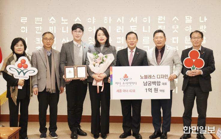 세종사회복지공동모금회(회장 박상혁, 이하 세종모금회)에 따르면 24일 10시30분 세종특별자치시청 세종실에서 남궁백합 노블레스 디자인 대표와 배우자 류원창씨, 최민호 세종시장, 박상혁 세종모금회장, 김윤회 세종 아너모임 대표 등이 참석한 가운데 ‘남궁백합 노블레스디자인 대표 세종 아너 42호 가입식’을 가졌다고 밝혔다.