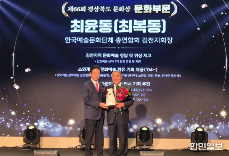 한민일보 서울포커스 임경복 기자 | 김천시는 지난 23일 안동 스탠포드호텔에서 열린 제66회 경상북도 문화상 시상식에서 최복동 한국예총 김천지회장(문화 부문), 김대철 도문요 대표(시각예술 부문)가 각각 수상했다고 밝혔다.