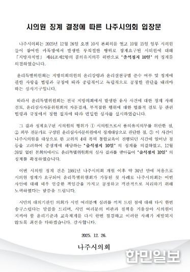 한민일보 서울포커스 임광현 기자 | 나주시의회는 2025년 12월 26일 오전 10시 본회의를 열고, 10월 15일 일부 시의원들이 참여한 카톡방에서 발생한 부적절한 행위로 징계요구된 시의원에 대해 '지방자치법' 제44조제2항의 품의유지의무 위반으로 ‘출석정지 10일’의 징계를 의결하고 입장문을 발표했다.