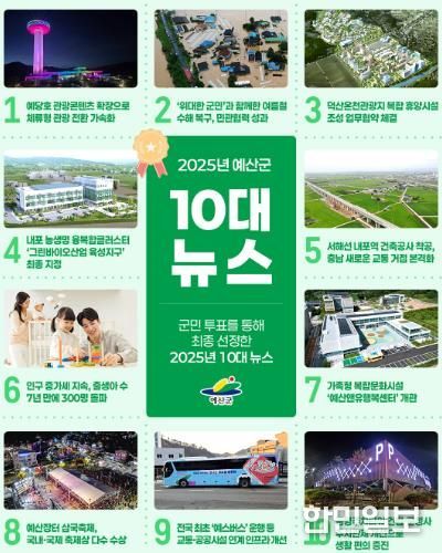 한민일보 서울포커스 임경복 기자 | 예산군은 2025년 한 해 동안 군정 전반에서 의미 있는 성과를 거둔 주요 정책과 사업을 담은 ‘2025년 올해의 군정 10대 뉴스’를 지난 10일부터 24일까지 진행한 군민 투표를 통해 최종 선정했다고 밝혔다.