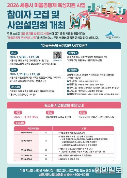 한민일보 서울포커스 김윤이 기자 | 세종특별자치시가 오는 12일부터 23일까지 ‘2026년 마을공동체 육성지원 사업’ 참여자를 모집한다.