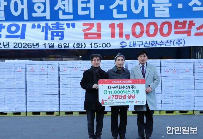 한민일보 서울포커스 김봉순 기자 | 대구농수산물도매시장 내 대구신화수산(주)(대표 고중근)은 1월 6일 대구농수산물도매시장에서 대구사회복지공동모금회를 통해 김 1만 1천 박스(7천만 원 상당)를 기부했다.