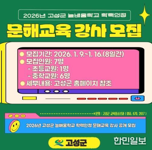 한민일보 서울포커스 김은금 기자 | 고성군은 2026년 학력인정 문해교육 프로그램의 원활한 운영을 위하여 강사 7명을 공개 모집한다고 밝혔다.