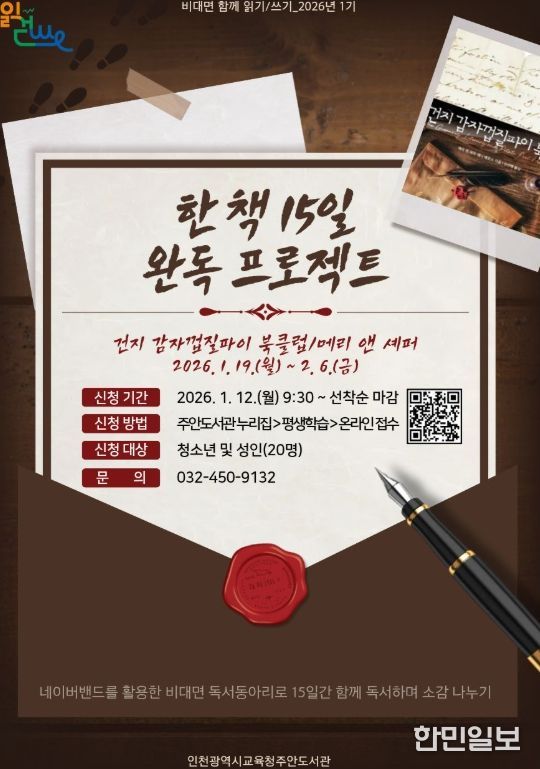 한민일보 서울포커스 유창렬 기자 | 인천광역시교육청주안도서관은 청소년과 성인을 대상으로 2026년 비대면 함께 읽기·쓰기'한 책 15일 완독 프로젝트'를 운영한다.