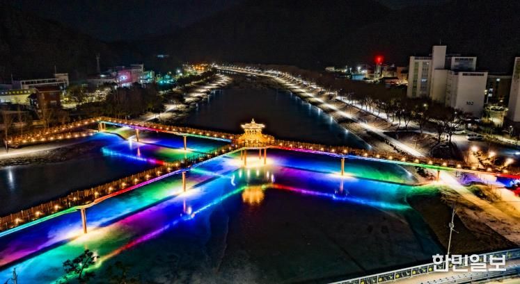 괴산읍 도심을 흐르는 성황천과 동진천 일대는 최근 강추위로 수면이 꽁꽁 얼어붙으면서, 두 하천을 연결하는 에코브릿지 하부에 설치된 다채로운 색감의 경관조명이 얼음 위로 선명하게 비쳐 고요한 겨울밤 속 색다른 장관을 만들어내고 있다.