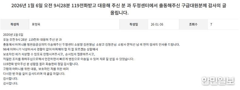 환자의 보호자는 천안서북소방서 칭찬게시판을 통해 “경황이 없는 상황에서 보호자인 제가 차분해질 수 있도록 안정시켜 주시고, 순서 있게 질문해 주셔서 적절한 조치를 할 수 있었다”며 “덕분에 어머니를 빠르게 병원으로 이송해 치료를 받을 수 있었다”고 깊은 감사의 뜻을 전했다.