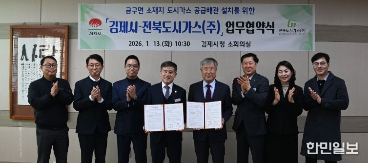 한민일보 서울포커스 박용남 기자 | 김제시는 전북도시가스 주식회사(대표 김홍식)와 13일 시청 소회의실에서 금구면 주민들의 에너지복지 향상을 위해 도시가스 공급배관 설치사업 업무협약을 체결했다고 밝혔다.