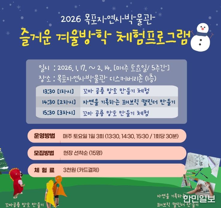 한민일보 서울포커스 임광현 기자 | 목포자연사박물관은 겨울방학을 맞아 어린이와 가족 관람객을 대상으로 상설 체험프로그램을 오는 1월 17일부터 2월 14일까지 운영한다.