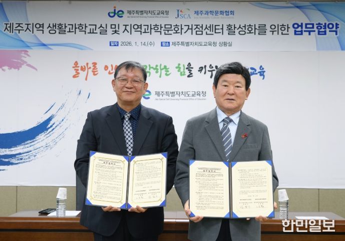 한민일보 서울포커스 임경복 기자 | 제주특별자치도교육청은 14일 도교육청 상황실에서 (사)제주과학문화협회와 제주지역 과학문화 확산 및 미래 핵심역량 강화를 위한 업무협약을 체결했다.