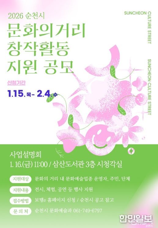 한민일보 서울포커스 임광현 기자 | 순천시는 문화의 거리를 예술특화 거점지역으로 육성하고 지역 예술인의 지속가능한 창작활동을 지원하기 위해 ‘2026년 순천시 문화의 거리 창작활동 지원사업’ 참여자를 공개 모집한다고 밝혔다.