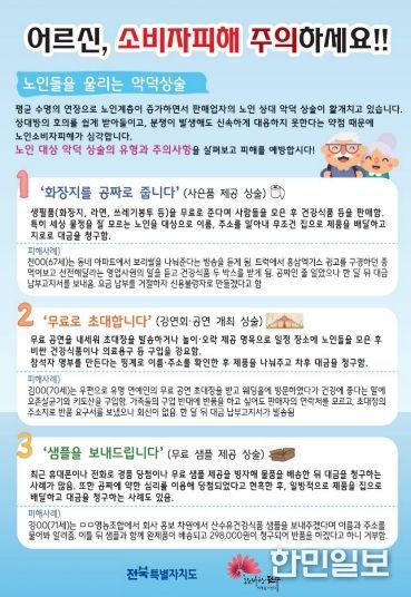한민일보 서울포커스 김용택 기자 | 최근 생필품 염가 판매나 무료 사은품 제공을 앞세워 소비자를 유인한 뒤 고가의 건강보조식품이나 전자제품 등을 판매하는 사례가 늘고 있는 가운데, 전주시가 피해 예방을 위해 주의해 줄 것을 당부했다.