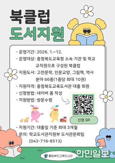 한민일보 서울포커스 임경복 기자 | 충청북도교육청 직속기관 교육도서관은 1월부터 12월까지 도내 교직원의 지속적인 독서 활동을 장려하고 책 읽는 문화를 확산하기 위해 2026년 '공감하는 북클럽 도서 지원 사업'을 연중 상시 운영한다.