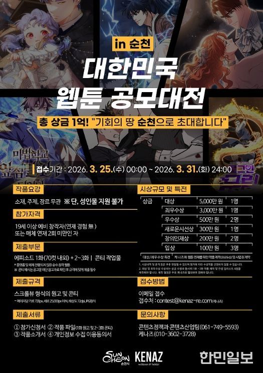한민일보 서울포커스 임광현 기자 | 순천시가 웹툰 앵커기업 케나즈와 손잡고 전국 신인 창작자들을 대상으로 '대한민국 웹툰 공모대전 in 순천'을 개최한다.