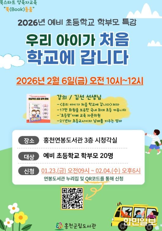 이번 교육은 2026년 예비 초등학교 학부모 특강 “우리 아이가 처음 학교에 갑니다”를 주제로, 2월 6일 오전 10시 연봉도서관에서 진행된다.