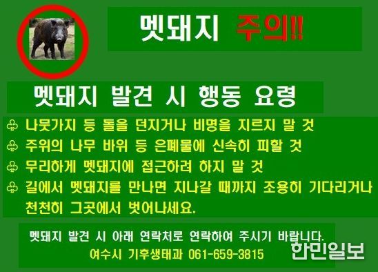 한민일보 서울포커스 임광현 기자 | 여수시는 최근 산행·산책로에서 멧돼지를 마주치는 등의 사례가 빈번하게 발생함에 따라 안전사고 예방을 위한 각별한 주의를 요구하고 있다.
