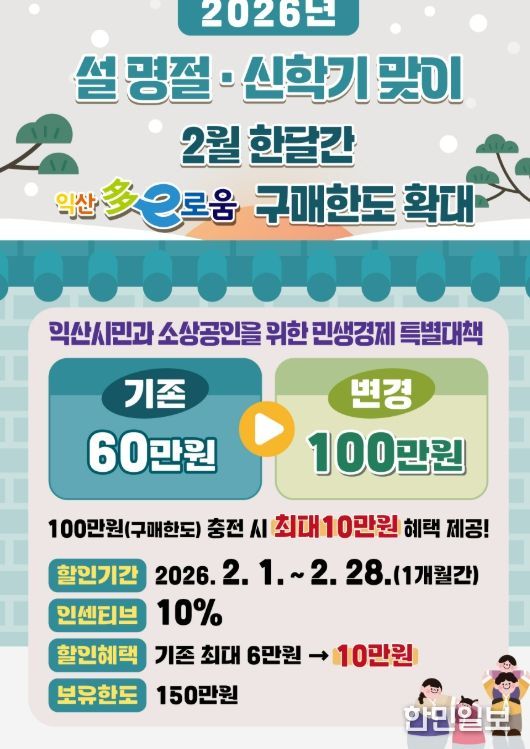 한민일보 서울포커스 김용택 기자 | 익산시 대표 효자 정책인 지역사랑상품권 '다이로움'이 2월 한 달 동안 파격적인 혜택으로 시민을 찾아간다.