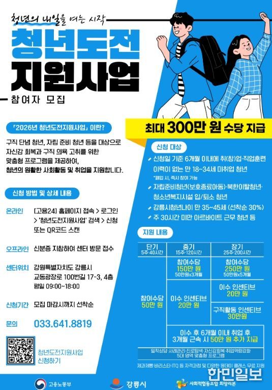 한민일보 서울포커스 임경복 기자 | 강릉시는 구직을 단념했거나 사회 진입에 어려움을 겪고 있는 청년들의 회복과 재도전을 지원하기 위해, ‘2026년 청년도전지원사업’ 참여자를 신규 모집하고 본격적인 사업 추진에 나선다고 밝혔다.