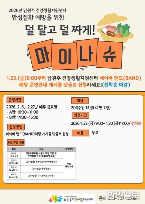 한민일보 서울포커스 임경복 기자 | 남원주건강생활지원센터는 지역 주민의 만성질환 예방과 관리를 위해 ‘덜 달고 덜짜게! 마이나슈 요리교실’ 프로그램 참여자를 모집한다.