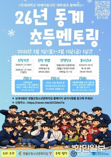 한민일보 서울포커스 진광성 기자 | 영월군청소년문화의집은 오는 2월 9일부터 13일까지 5일간 영월 관내 초등학생을 대상으로 ‘2026년 동계 초등멘토링 프로그램’을 운영한다고 밝혔다.