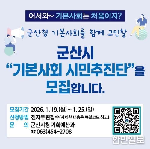 한민일보 서울포커스 김용택 기자 | 군산시가 오는 25일까지 ‘기본사회’ 밑그림을 함께 그려 나갈 ‘군산시 기본사회 시민추진단’을 공개 모집한다.