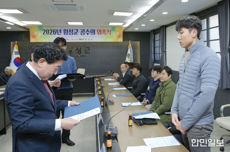 한민일보 서울포커스 진광성 기자 | 횡성군은 1. 21. 군청 2층 소회의실에서 ‘2026년 공수의 위촉식’을 개최하고, 가축 전염병 예방을 위한 본격적인 활동에 들어갔다고 밝혔다. 이번에 위촉되는 공수의는 13명으로 이는 강원특별자치도 내 시‧군 중 가장 많은 인원이다.