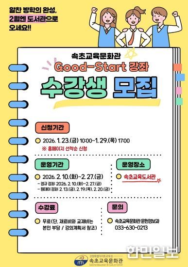 한민일보 서울포커스 임경복 기자 | 속초교육문화관(관장 이윤전)은 2월 10일부터 27까지 10일간 속초교육도서관에서 예비 초·중·고등학생, 초등 가족을 대상으로 ‘2026년 굿 스타트(Good-Start) 강좌’를 운영한다.
