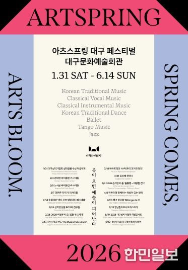 한민일보 서울포커스 김봉순 기자 | 대구문화예술회관은 대구를 기반으로 활동하는 지역 예술인들의 공연을 한데 모아 그들의 예술혼을 집중 조명하는 축제 '2026 아츠스프링 대구 페스티벌'의 16개 공연을 오는 1월 31일부터 6월 14일까지 대구문화예술회관에서 개최한다고 밝혔다.