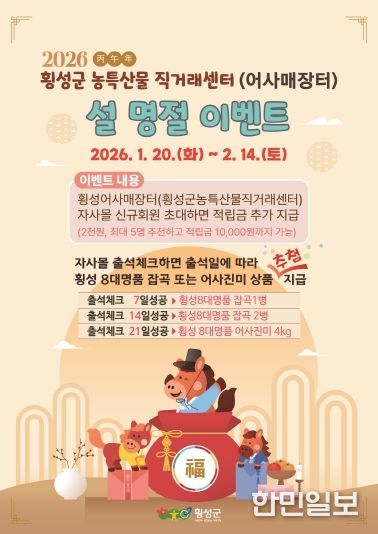 한민일보 서울포커스 진광성 기자 | 횡성군 농특산물 직거래센터의 공식 온라인 쇼핑몰인 ‘횡성어사매장터’가 2026년 설 명절을 맞아 지역 농특산물 소비 촉진을 위한 특별 이벤트를 진행한다.
