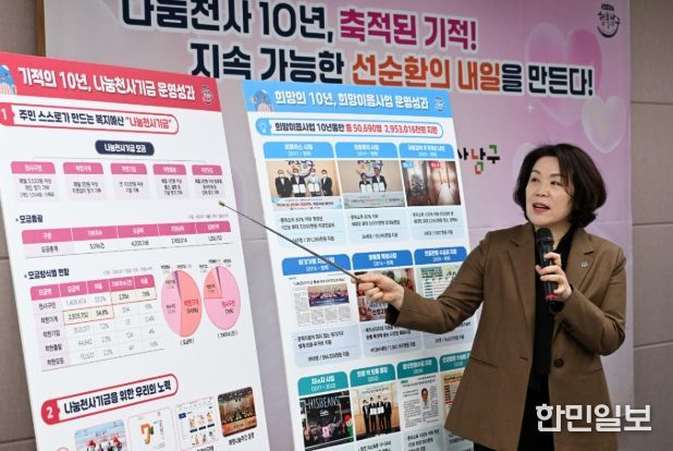한민일보 서울포커스 기자 | 울산 남구는‘나눔천사 구(區)’선포 10주년을 맞아 지난 10년간의 모금과 복지사업의 결실을 공유하고 모금 방식의 패러다임 전환과 더욱 촘촘한 틈새 복지사업 추진, 기부자 예우 강화, 보이는 가치 홍보 등 4대 혁신을 통한 미래 비전을 공개했다.