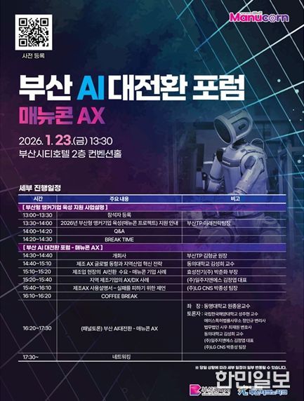 한민일보 서울포커스 임광현 기자 | 부산시는 23일 오후 1시 30분 연제구 부산시티호텔 2층 컨벤션홀에서 (재)부산테크노파크 주관으로 '2026 부산형 앵커기업 육성 지원사업 설명회 및 부산 AI대전환 포럼 – 매뉴콘 AX'를 개최한다고 밝혔다.