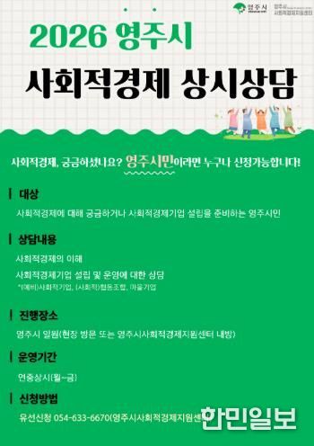 한민일보 서울포커스 김봉순 기자 | 영주시와 영주시사회적경제지원센터는 사회적경제에 대한 시민들의 이해를 높이고 신규 사회적경제기업 발굴을 지원하기 위해 ‘2026 영주시 사회적경제 상시상담’을 연중 운영한다고 밝혔다.