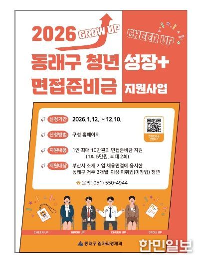 한민일보 서울포커스 임광현 기자 | 부산 동래구는 청년들의 구직 과정에서 발생하는 경제적 부담을 덜어주기 위해 ‘2026년 동래구 청년 성장+ 면접준비금 지원사업’을 추진한다고 밝혔다.