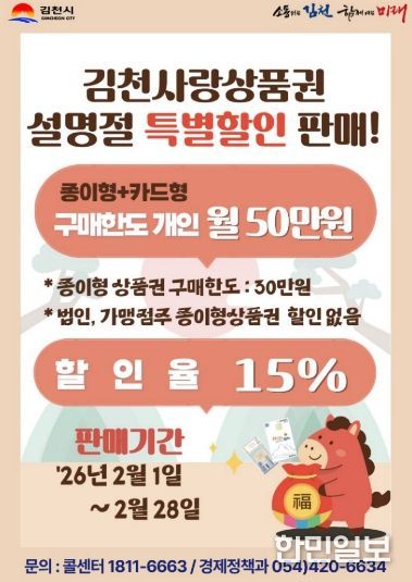한민일보 서울포커스 임경복 기자 | 김천시는 오는 설 명절을 앞두고 2월 한달간 김천사랑상품권을 15% 특별 할인 판매하여 지역 소비 활성화에 나선다.