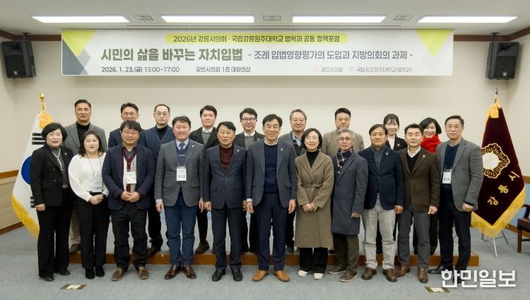 한민일보 서울포커스 임경복 기자 | 강릉시의회와 국립강릉원주대학교가 시민 중심의 자치입법 실현을 위해 힘을 모았다. 양 기관은 지난 21일 지방 입법정책 발전과 지역공익 법률 지원을 위한 업무협약(MOU)을 체결한 데 이어, 23일 오후 3시 강릉시의회 대회의실에서 '시민의 삶을 바꾸는 자치입법' 정책포럼을 공동 개최했다.