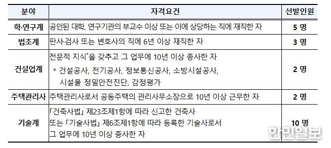 하자심사·분쟁조정위원회 제9기 위원 모집은 학·연구계, 법조계, 건설업계, 주택관리사, 기술계(건축사, 기술사) 5개 분야별 전문가를 대상으로 한다.