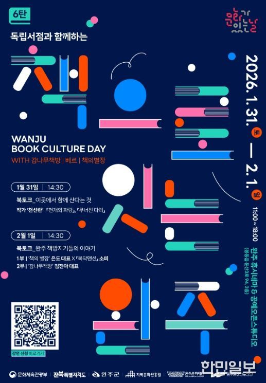 한민일보 서울포커스 박용남 기자 | 완주문화재단은 오는 1월 31일부터 2월 1일까지 이틀간 완주 휴시네마와 공예오픈스튜디오에서 '문화가 있는 날 6탄 – 책으로 잇는 완주'를 개최한다.