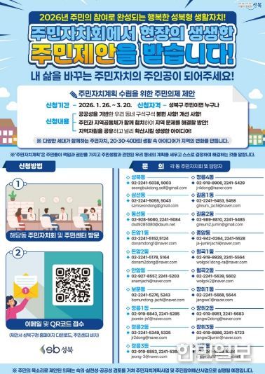 성북구 관계자는 “20~40대 세대의 참신한 아이디어부터 어르신들의 지혜까지 전 세대의 목소리를 담는 과정이 곧 성북형 주민자치의 핵심 동력”이라며, “주민이 동네 변화의 주체가 되어 직접 결정하고 실천하는 주민자치계획에 생생한 현장의 목소리가 반영될 수 있도록 많은 참여와 관심을 부탁드린다”고 전했다.