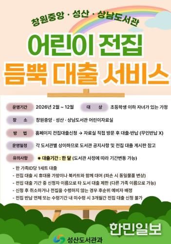 한민일보 서울포커스 김서윤 기자 | 창원특례시 도서관사업소 성산도서관과는 초등학생 이하 자녀를 둔 가정을 대상으로 도서 구입비 부담을 줄이고 독서 생활화를 지원하기 위해, 어린이 전집 한 세트 전체를 한 달간 대출해주는 ‘듬뿍(Book) 대출 서비스’를 운영한다고 밝혔다.