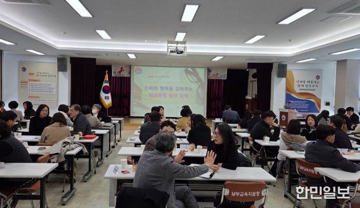 한민일보 서울포커스 임경복 기자 | 대구남부교육지원청은 1월 29일 오후 2시 남부교육지원청 대회의실에서 초등학교 교장 및 공립유치원 원장 70여 명을 대상으로 ‘신뢰와 협력을 강화하는 학교 경영’을 주제로 연수를 실시한다고 밝혔다.