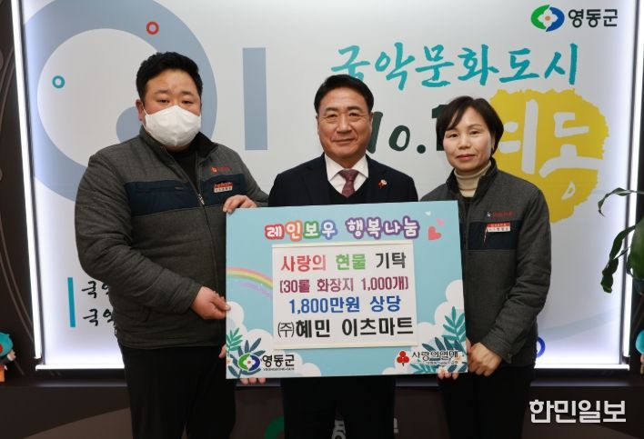 한민일보 서울포커스 김다남 기자 | ㈜혜민 이츠마트(대표 정진흥)는 4일 영동군청을 방문해 지역 내 어려운 이웃을 돕기 위한 현물 기탁 30롤 화장지 1,000개(1,800만 원 상당)를 기탁했다.