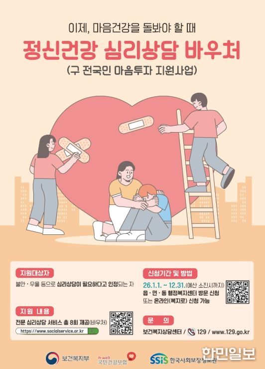 한민일보 서울포커스 김다남 기자 | 옥천군은 우울·불안 등 정서적 어려움을 겪고 있는 주민에게 전문적인 심리상담 서비스를 제공하는‘심리상담 바우처 지원사업(구 전국민 마음투자 지원사업)’ 대상자를 모집한다고 밝혔다.