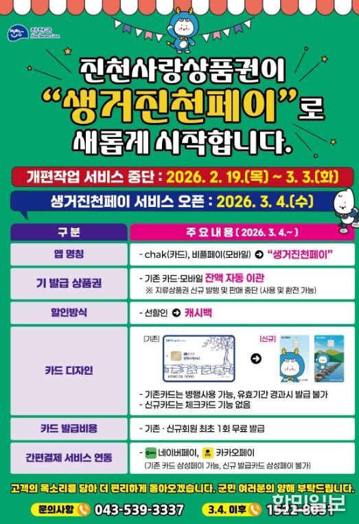 한민일보 서울포커스 김다남 기자 | 충북 진천군은 진천사랑상품권 시스템을 전면 개편해 ‘생거진천페이’로 오는 3월 4일부터 서비스를 재개한다고 6일 밝혔다.