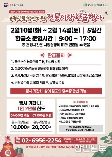 백은정 경제정책과장은 “설 명절을 맞아 전통시장을 찾는 소비자들의 장바구니 물가 부담을 덜어주는 계기가 되길 바란다”며 “이번 행사가 전통시장 이용 확대와 지역 경제 활성화로 이어지길 기대한다”고 말했다.