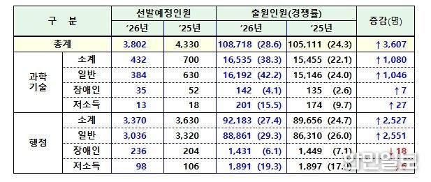 올해는 선발 예정 인원이 지난해 대비 감소했으나 응시원서 제출 인원은 지난해보다 3,607명, 3.4% 증가해 경쟁률이 4.3 대 1 높아졌다.