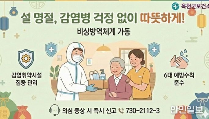 한민일보 서울포커스 김다남 기자 | 옥천군보건소는 설 명절을 맞아 군민들이 안심하고 명절을 보낼 수 있도록 수인성·식품매개 감염병과 호흡기 감염병 예방을 위한 ‘설 명절 대비 비상방역체계’를 운영한다고 밝혔다.