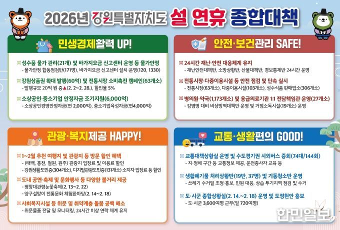 한민일보 서울포커스 곽중희 기자 | 강원특별자치도는 2월 14일부터 18일까지 5일간 이어지는 설 명절을 맞아 도민과 귀성객, 방문객 모두가 안전하고 즐거운 명절을 보낼 수 있도록 ‘설 연휴 종합대책’을 추진한다.