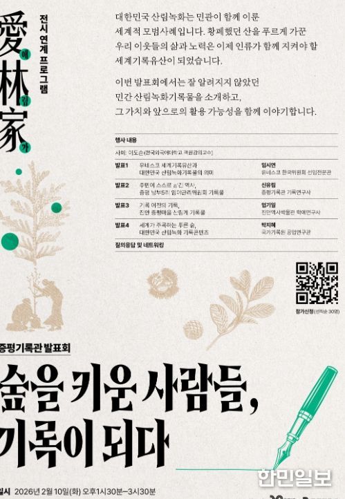 한민일보 서울포커스 김다남 기자 | 충북 증평군은 10일 증평기록관에서 산림녹화 기록전시 ‘애림가(愛林家)’와 연계한 발표회 ‘숲을 키운 사람들, 기록이 되다’를 개최했다.