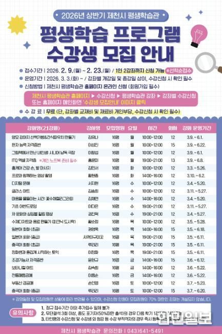 한민일보 서울포커스 김다남 기자 | 제천시가 2월 23일까지 2026년 상반기 평생학습관 프로그램 수강생을 모집한다.