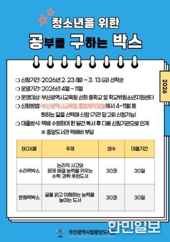 한민일보 서울포커스 임광현 기자 | 부산광역시립중앙도서관은 청소년의 문해력과 수리력 향상을 돕기 위한 도서 단체 대출 서비스인 ‘청소년을 위한 공·구박스(공부를 구하는 박스)’를 운영한다.